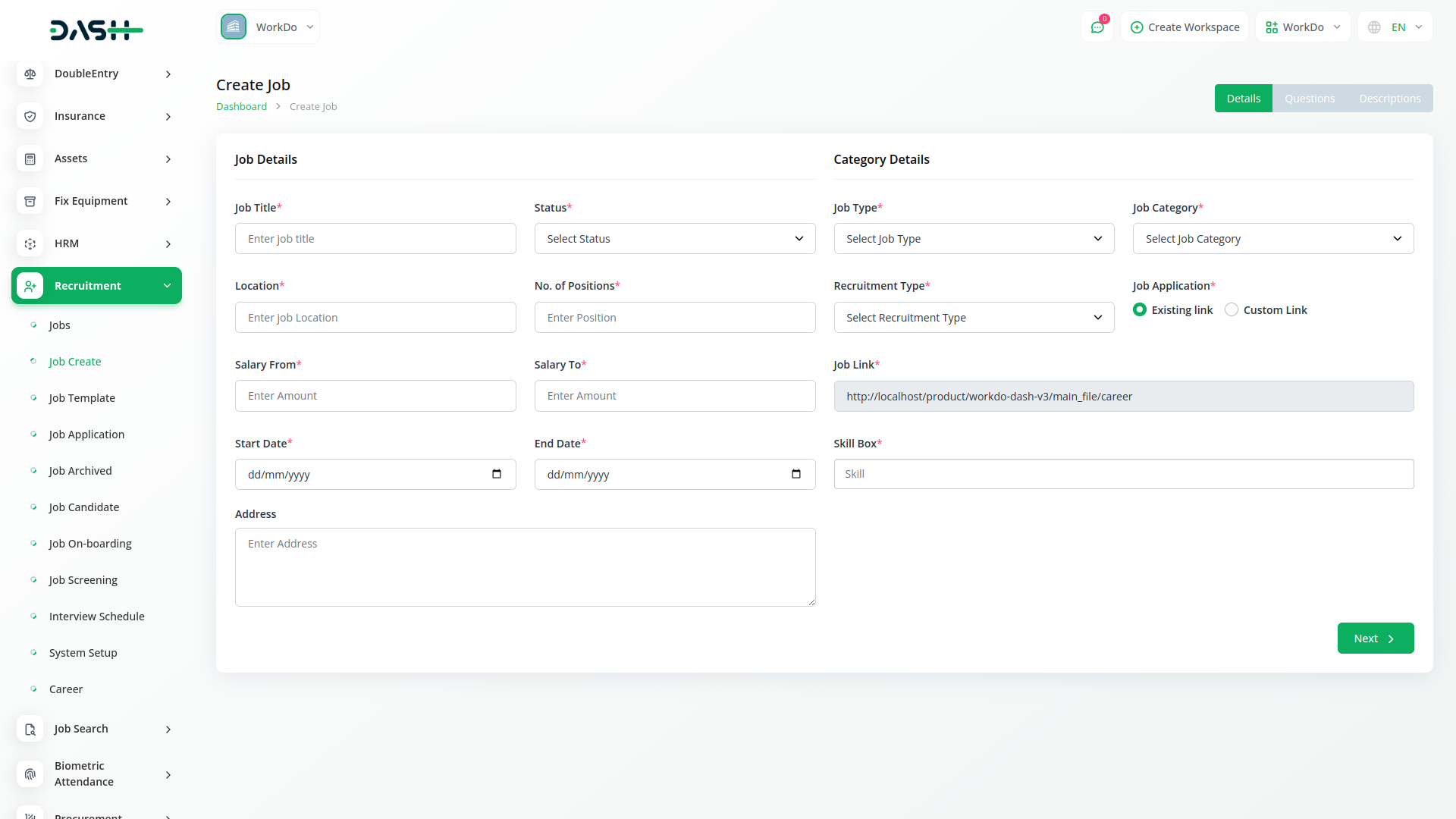 The Recruitment module allows users to easily add links to job applications, whether using an existing URL or generating a custom link. These links can be shared directly with candidates or embedded on external platforms to drive traffic to specific job postings. This streamlined functionality ensures maximum visibility and accessibility for job applications, helping recruiters connect with a wider pool of qualified applicants.
